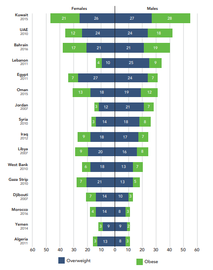 In Bahrain, Egypt, Jordan, Kuwait, Saudi Arabia, and the United Arab Emirates, adult obesity (BMI ≥ 30) is becoming a major issue in both men and women, and almost 25% of the MENA population suffers from hypertension. Estimates from the Global Burden of Disease (GBD) study show that the highest prevalence of obesity among adults 20 years or older in 2015 was observed in Qatar, with 42.5% among males and 52.4% among females, and in the younger population of children 2–19 years in Kuwait with 22.1% among males and 19.2% among females (GBD 2015). While tobacco use is declining worldwide, according to the World Health Organization (WHO) Global Report on Trends in Tobacco Smoking 2000–2025, the prevalence of tobacco smoking in the MENA region is projected to increase between 2010 and 2025.